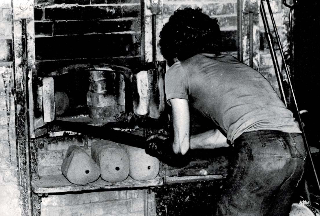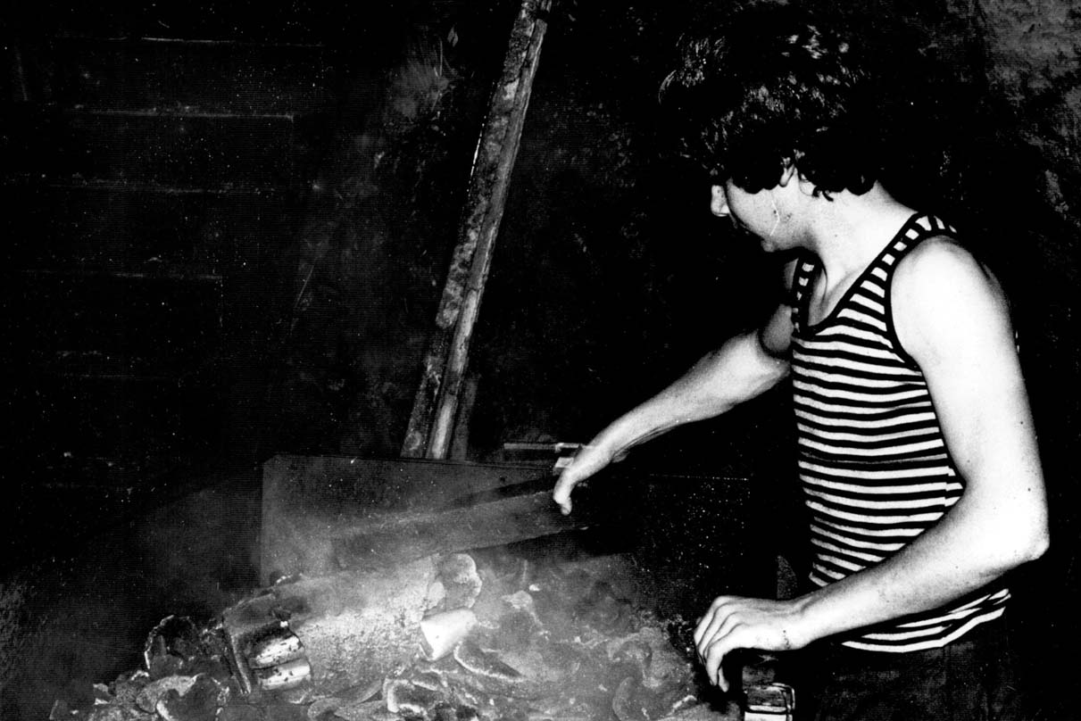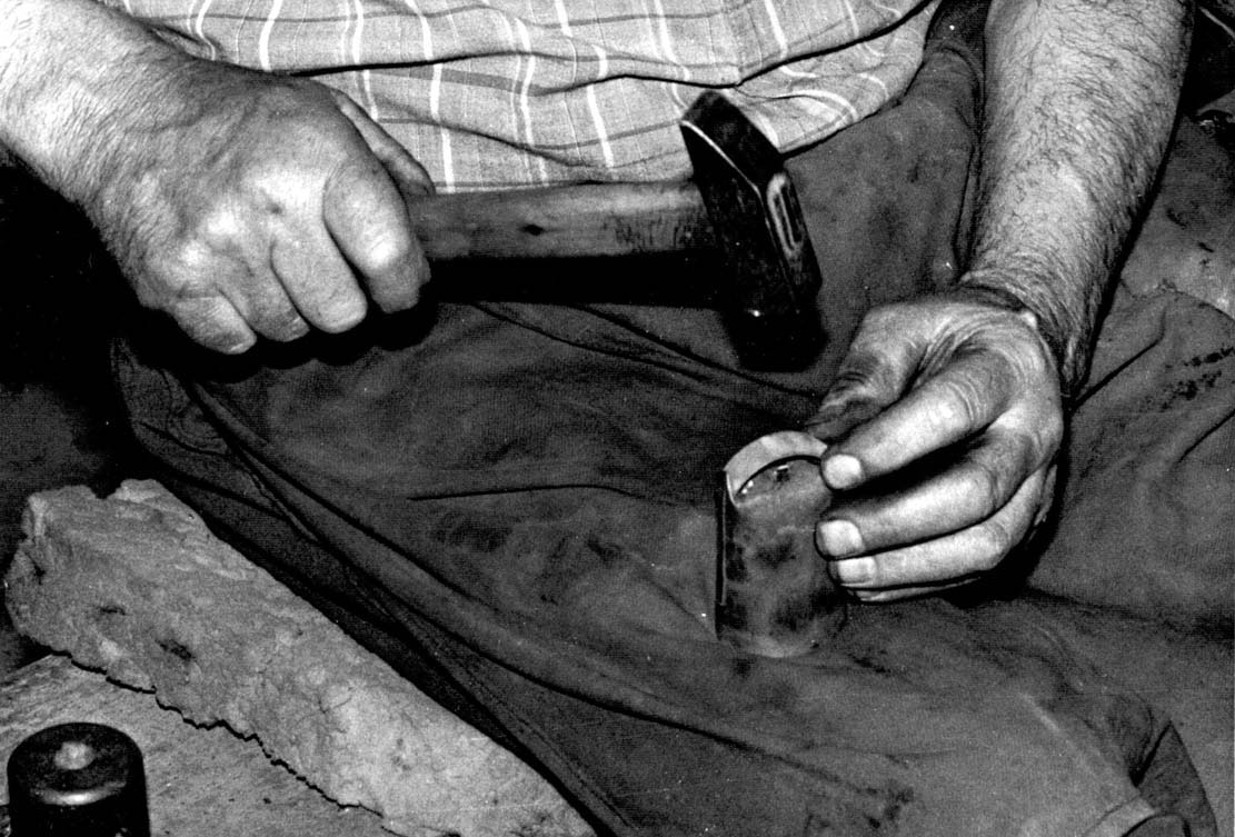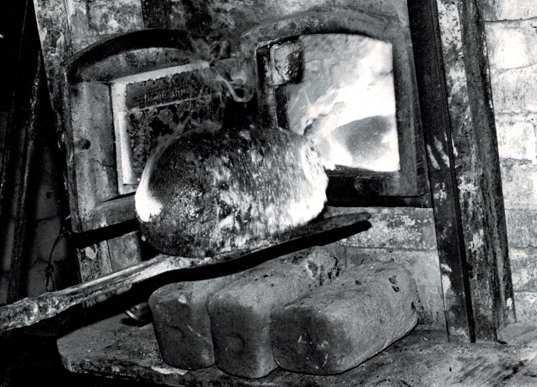 En effet, lorsque la sonnaille est façonnée, vient la cuisson qui est la même pour tous les pains, qu’ils soient garnis par des redons, des piques, des piquons ou des pyrénéennes. Nous nous procurons l’argile juste à côté des mines de charbon. Elle est d’abord concassée à un broyeur à marteaux et lorsqu’elle est réduite en poussière très fine, elle passe à un vieux pétrin de boulanger, dans lequel on mélange de la paille et de l’eau ; on obtient une pâte qui nous sert à faire les moules. La paille sert de liant pour que le pain d’argile résiste à 1.500 degrés de chaleur dans notre four. Sans paille, l’argile se fendille et le laiton n’est plus contenu dans le moule ; il se perd dans la braise. En effet, du laiton a été mis à l’intérieur des pains pour l’encuivrage, dans la sonnette et le pain. A la cuisson, on n’a pas d’appareil de contrôle ; c’est à la couleur de la flamme que nous reconnaissons le moment exact pour extraire le moule du four et enlever l’excédent de laiton au plus vite, avant le refroidissement. Environ un quart d’heure – vingt minutes après, le pain est trempé dans l’eau, il est cassé par la suite pour récupérer les sonnettes et l’argile cuite n’est pas récupérable. Le temps de cuisson varie entre une heure et une heure et demie suivant l’épaisseur de la tôle contenue dans les moules. Lorsque  les sonnailles sont sorties des pains, on les lave, on les sèche et elles sont poncées pour leur donner un brillant et être plus propres à la vente. Après quoi, elles sont refaçonnées parce qu’au brasage elles sont toujours un peu voilées par la chaleur, et martelées pour obtenir le son exact que veulent les bergers.