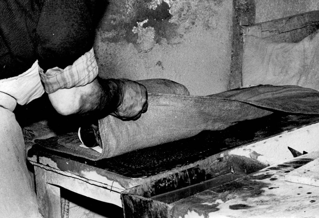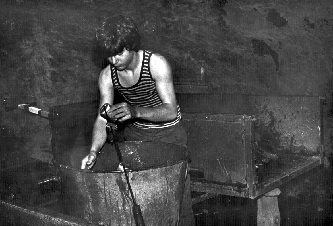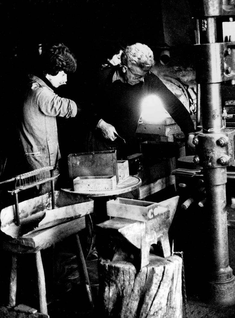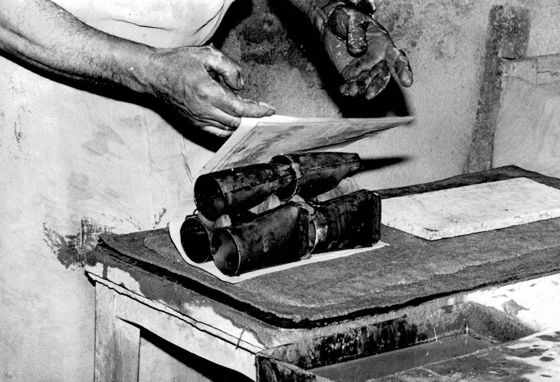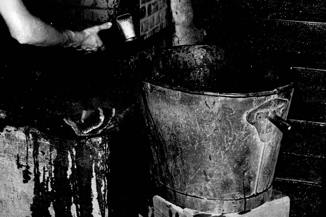 En effet, lorsque la sonnaille est façonnée, vient la cuisson qui est la même pour tous les pains, qu’ils soient garnis par des redons, des piques, des piquons ou des pyrénéennes. Nous nous procurons l’argile juste à côté des mines de charbon. Elle est d’abord concassée à un broyeur à marteaux et lorsqu’elle est réduite en poussière très fine, elle passe à un vieux pétrin de boulanger, dans lequel on mélange de la paille et de l’eau ; on obtient une pâte qui nous sert à faire les moules. La paille sert de liant pour que le pain d’argile résiste à 1.500 degrés de chaleur dans notre four. Sans paille, l’argile se fendille et le laiton n’est plus contenu dans le moule ; il se perd dans la braise. En effet, du laiton a été mis à l’intérieur des pains pour l’encuivrage, dans la sonnette et le pain. A la cuisson, on n’a pas d’appareil de contrôle ; c’est à la couleur de la flamme que nous reconnaissons le moment exact pour extraire le moule du four et enlever l’excédent de laiton au plus vite, avant le refroidissement. Environ un quart d’heure – vingt minutes après, le pain est trempé dans l’eau, il est cassé par la suite pour récupérer les sonnettes et l’argile cuite n’est pas récupérable. Le temps de cuisson varie entre une heure et une heure et demie suivant l’épaisseur de la tôle contenue dans les moules. Lorsque  les sonnailles sont sorties des pains, on les lave, on les sèche et elles sont poncées pour leur donner un brillant et être plus propres à la vente. Après quoi, elles sont refaçonnées parce qu’au brasage elles sont toujours un peu voilées par la chaleur, et martelées pour obtenir le son exact que veulent les bergers.