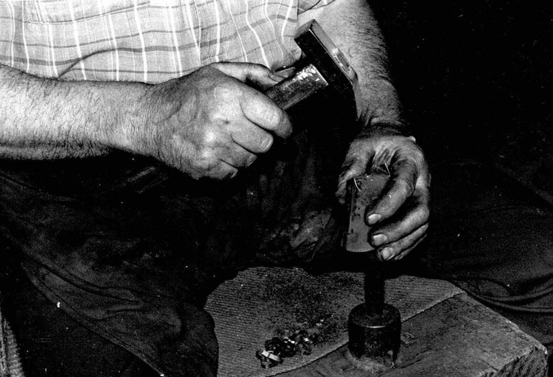 A certaines, on met un battant en zinc et à d’autres, à la demande des éleveurs, on peut placer un battant en os. Suivant la région et les coutumes… Pour fabriquer le battant, on utilise un fil de fer qui est placé dans un moule sur lequel on coule du zinc ; après quoi, on renverse presque immédiatement le moule pour que les battants se séparent. Il faut aussi, à l’aide de la pince, faire un cochet au battant pour le placer sur les sonnettes.
