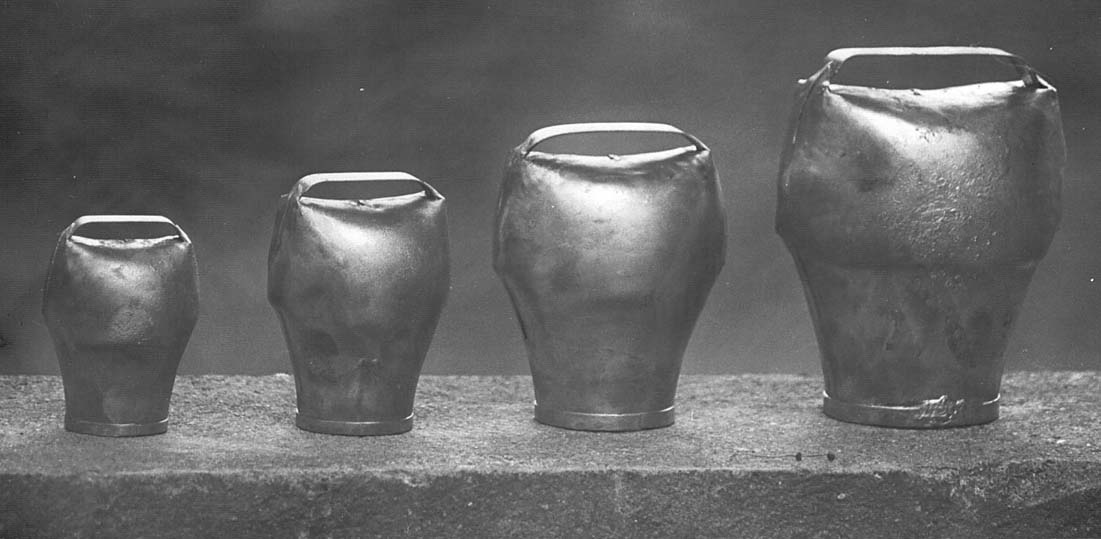 Pour une sonnaille bombée, est utilisée une forme découpée différemment qu’il faut passer sur une matrice, à la presse à emboutir, pour l’incurver. La forme est ensuite entaillée, façonnée ; en plus du porte-battant et de l’anse, est fixée une bordure sur la bouche.