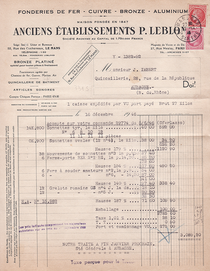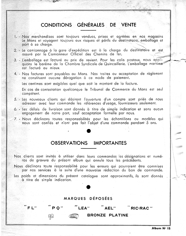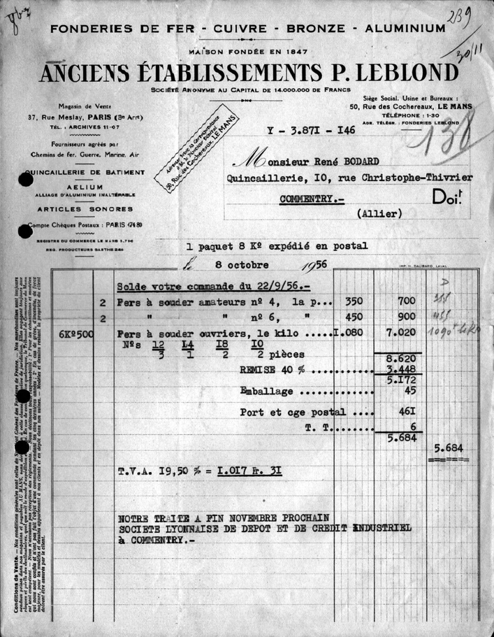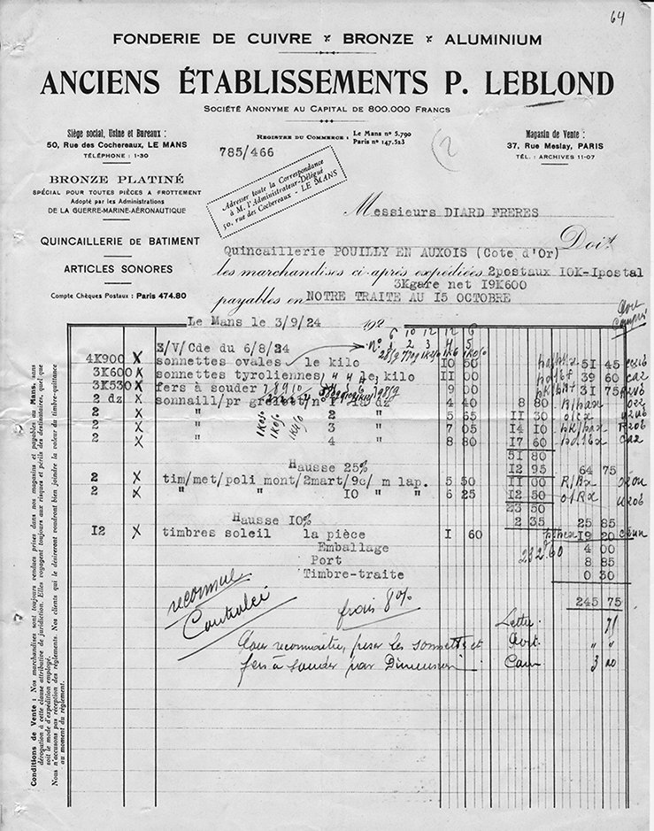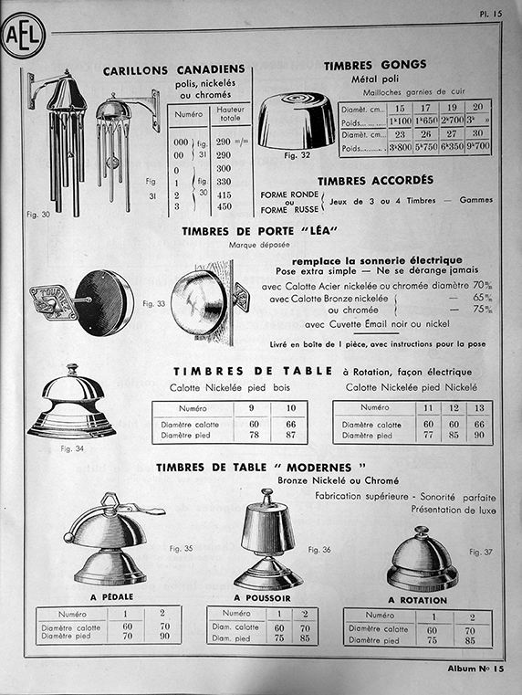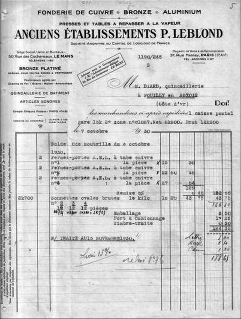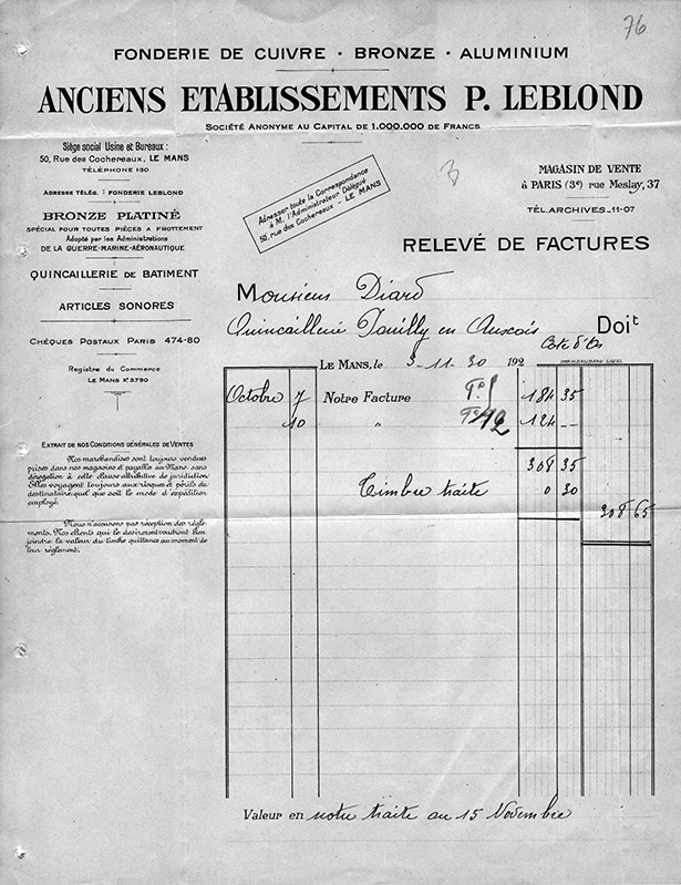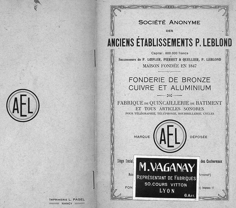 Datées 1924 à 1956, on trouve des factures et des catalogues intitulés « AEL, Anciens établissements Leblond », même adresse, 50 rue des Cochereaux, Le Mans, et même numéro de tél. : 1.30. L’entreprise dispose d’un magasin à Paris 3e , 37 rue Meslay. Il s’agit probablement d’un simple changement de nom d’entreprise.