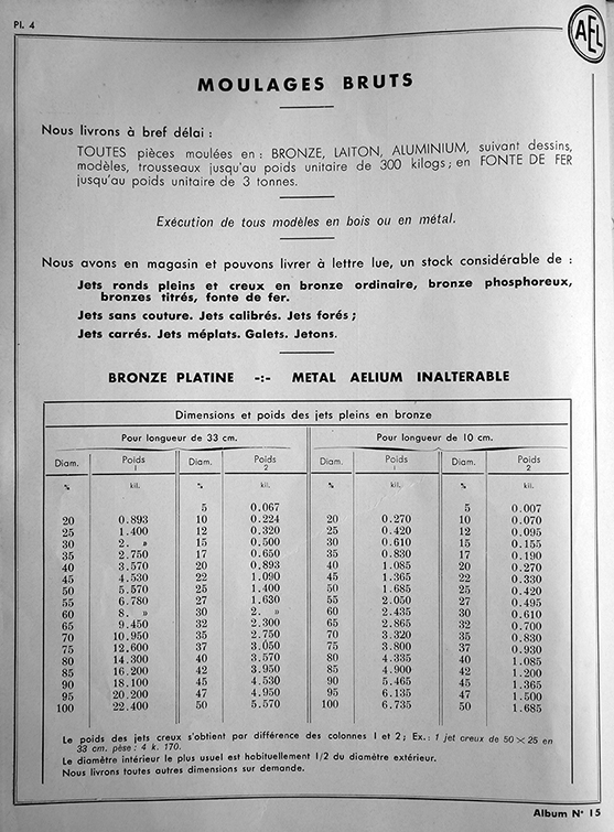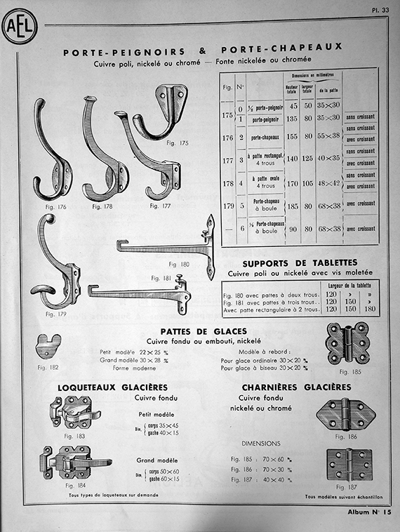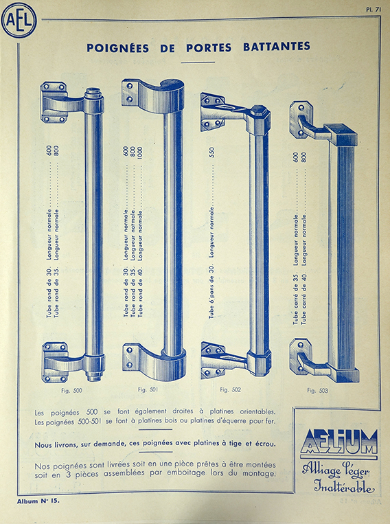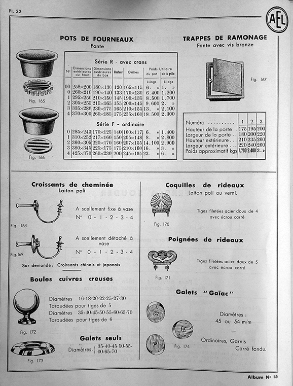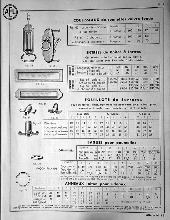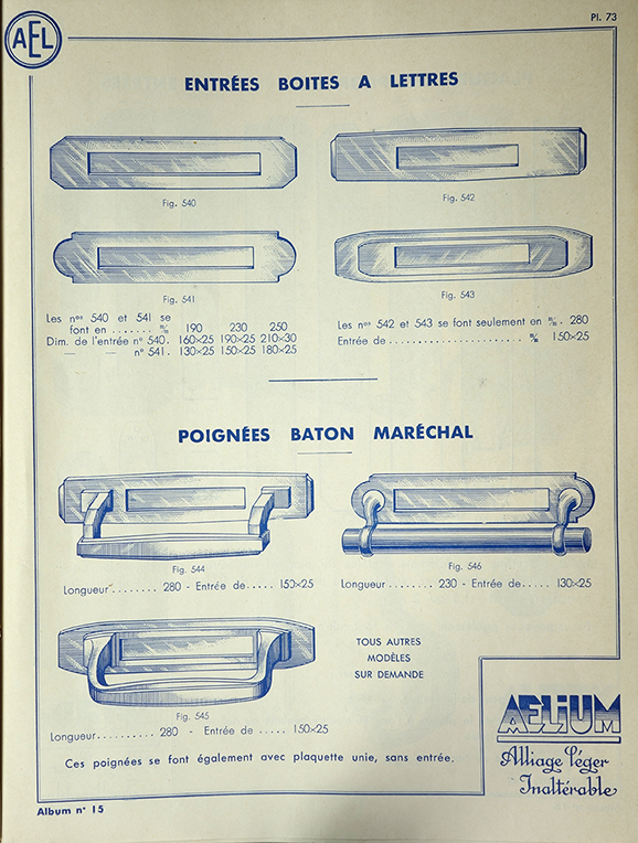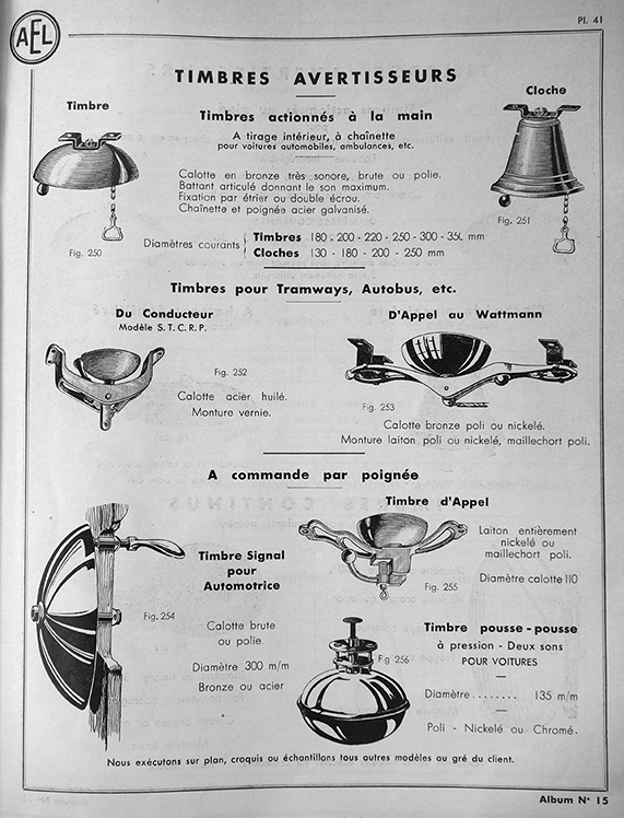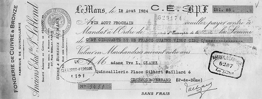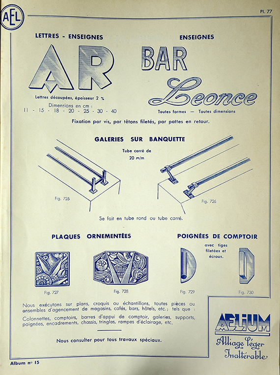 Datées 1924 à 1956, on trouve des factures et des catalogues intitulés « AEL, Anciens établissements Leblond », même adresse, 50 rue des Cochereaux, Le Mans, et même numéro de tél. : 1.30. L’entreprise dispose d’un magasin à Paris 3e , 37 rue Meslay. Il s’agit probablement d’un simple changement de nom d’entreprise.