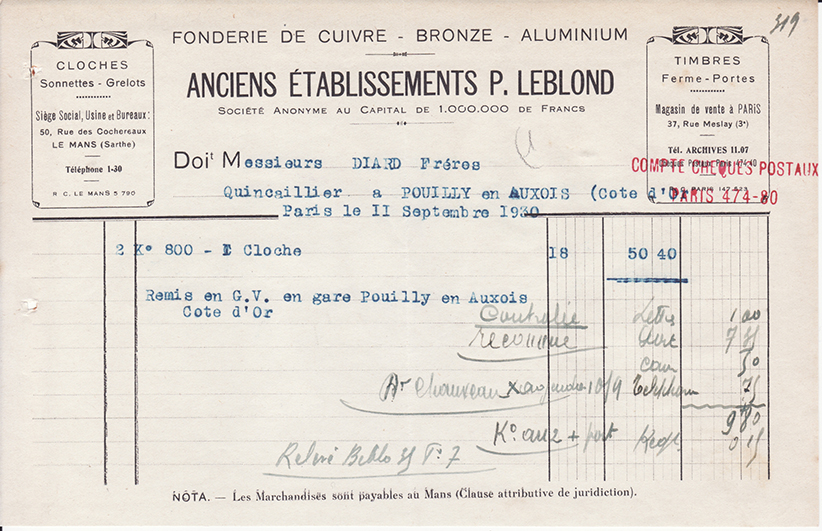 L’entreprise s’installe, au 50, rue des Cochereaux au Mans en 1880. La fonderie exerce diverses activités (voir articles cités plus haut). 35 ouvriers réalisent des grelots, des timbres et des clochettes. On surnomme cette fonderie « Les grelots ».