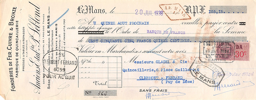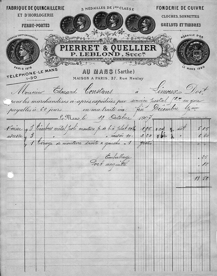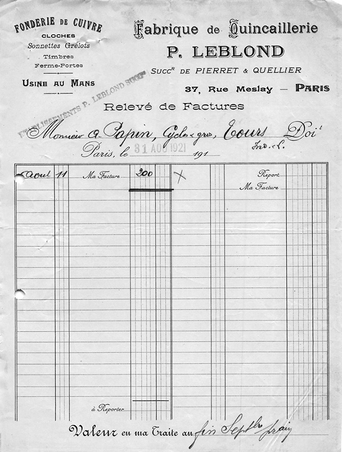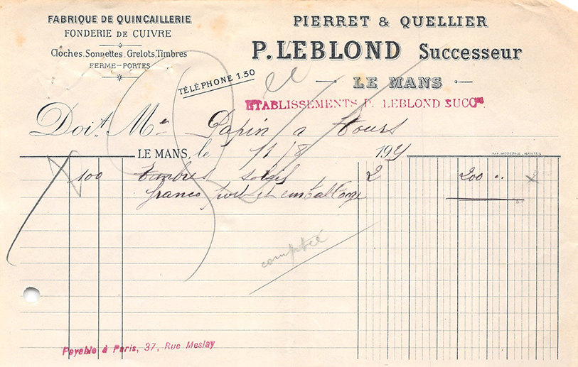 En 1904, Paul Leblond reprend l’affaire et emploie 75 ouvriers. En 1907, il créé des timbres pour les bicyclettes.