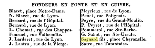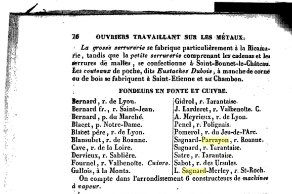 L’entreprise Sagnard fils (fondeur de fonte et cuivre) est déjà installée en 1830 place Chavanelle à Saint-Etienne. En 1835, Sagnard-Parrayon rue Roanne, Sagnard rue Tarantaise, L.Sagnard-Merley rue St-Roch figurent dans la Revue industrielle de Saint-Etienne. En 1841, la population se plaint des gênes occasionnées place Marengo par la fonderie Sagnard-Parrayon. L’acte de mariage entre Pierre-Marie Sagnard et Marie-Vivant Parrayon démontre que le nom accollé est celui de l’épouse.
