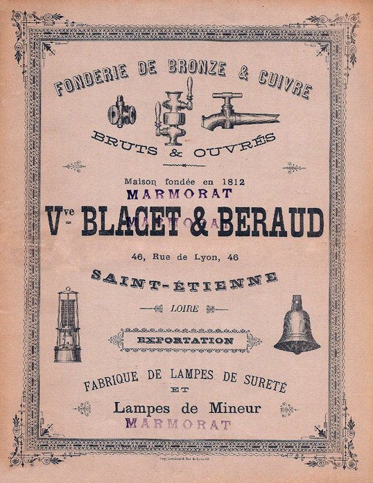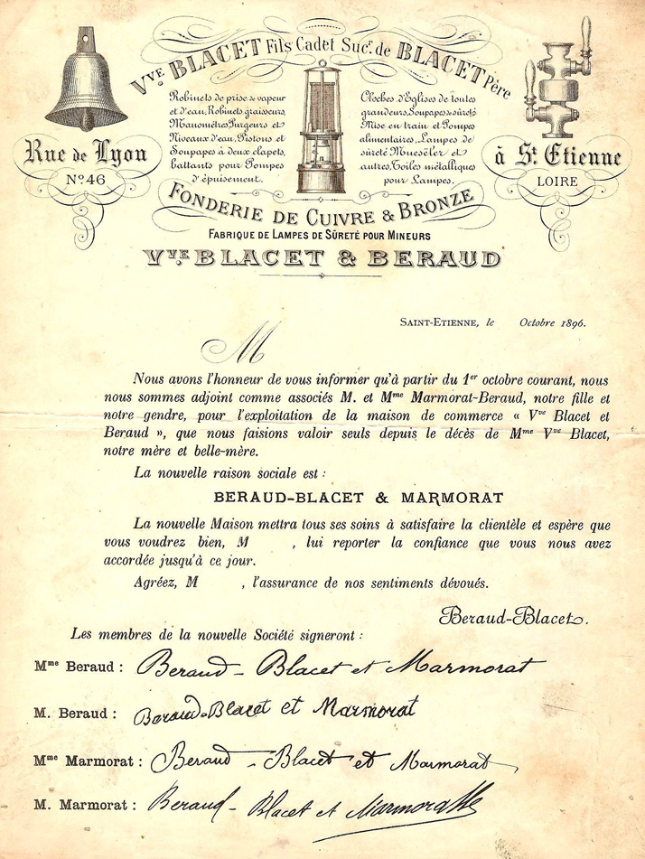 Le 1er octobre 1896, le couple Béraud-Blacet associent leur fille Marie-Claudine Béraud et son mari Louis-Mathieu Marmorat pour créer la raison sociale BERAUD-BLACET & MARMORAT. Ils vendent des robinets, du matériel pour pompes et fabriquent des lampes de sureté pour mineurs, mais aussi des cloches d’églises de toutes grandeurs dont on ne retrouve pas trace aujourd’hui dans les clochers.