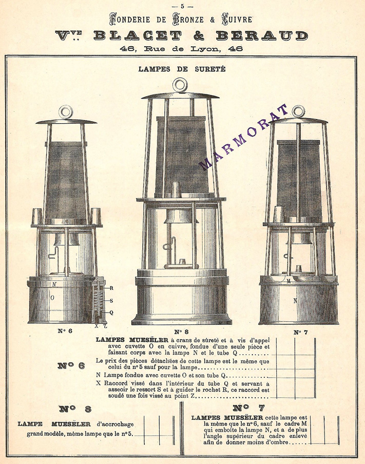 Le 5 avril 1859, « Blacet fils cadet (Mathieu), fondeur, rue de Lyon, N°7 à Saint-Etienne dépose un brevet pour perfectionnements apportés à la lampe de mineur dite de sureté ou de Davy. »