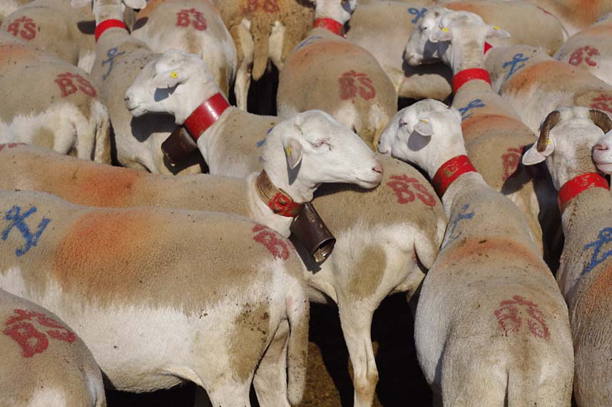 Pour la transhumance 2013, Bruno Serieys et Damien Dussaud n’ont pas mis de pompons. Le troupeau était uniforme par le son, compact, blanc, marqué uniquement en rouge et bleu avec des colliers de ces deux couleurs à part quelques exemplaires sculptés. Seule concession à la rigueur, les boucs portent des colliers lyres provençaux.