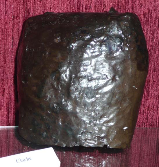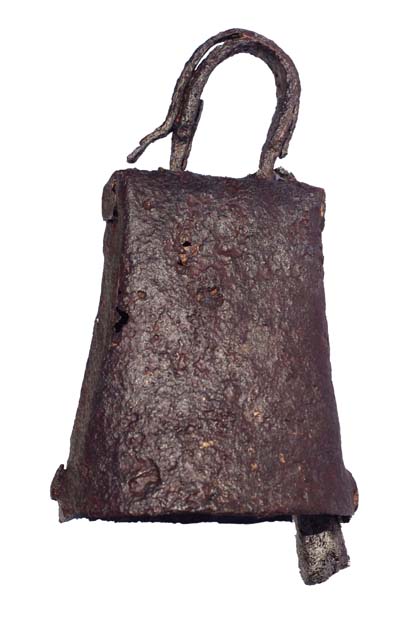 La clochette en bronze coulé, également découverte à Lazer, est un modèle à piquet (anse percée d’un simple trou) sur lequel on place une lanière en cuir (conjuscle) qui se fixe sur le collier en bois de la bête.