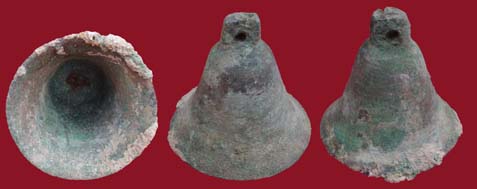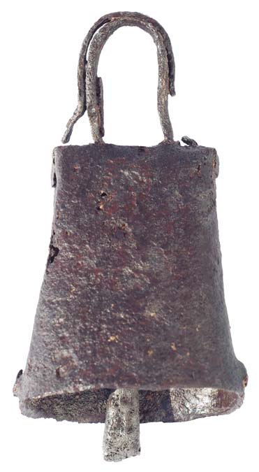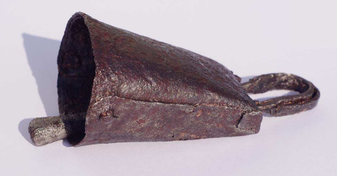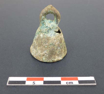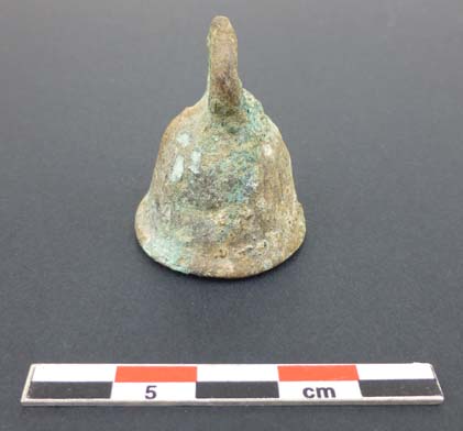 La petite clochette en bronze trouvée en 2012 en Ardèche, dans un contexte stratigraphique certain entre XII et XIIIeme siècles, mesure 35 mm de hauteur pour un diamètre à la bouche de 28 mm. L’iconographie des chevaux ensonnaillés, l’environnement minier du site et la pratique traditionnelle permettent d’émettre l’hypothèse d’une clochette faisant partie d’un ensemble placé sur le collier d’un équidé : cheval, âne, mule, mulet. Aujourd’hui, cette petite clochette est parfois placée au bas d’une grelotière.