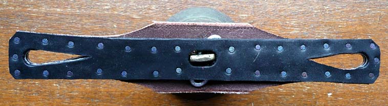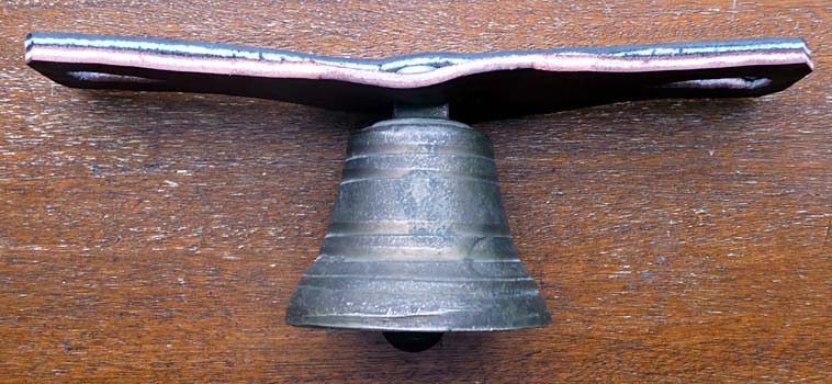Le battant conique, en métal forgé, s’enroule directement sur la bélière. Par sa longueur, il dépasse d’un centimètre sous la bouche aussi nommée jupe. La bélière (aussi nommée boucle, porte-battant, colombelle) et l’anse (ganse) sont forgées d’une seule pièce qui passe à travers le cerveau dans deux trous de 5 millimètres de diamètre. Un renfort incrusté par forgeage est aménagé à l’extérieur de l’anse, il était fixé (soudé ?) sur les épaules.
