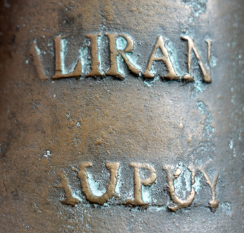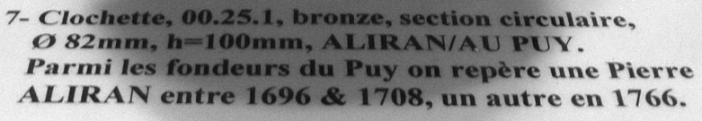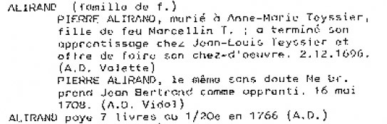 Dans sa liste des fondeurs du Puy, Roger Gounot cite Pierre Alirand, marié à Anne-Marie Teyssier décédée avant 1734. Il termine son apprentissage en 1696 et prend un apprenti en 1708.