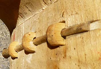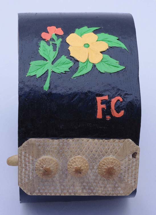 Le collier cévenol est plié dans une planche de micocoulier aménagée à la plane. Une bûche triangulaire le maintient fermé en passant dans trois ou quatre clés.