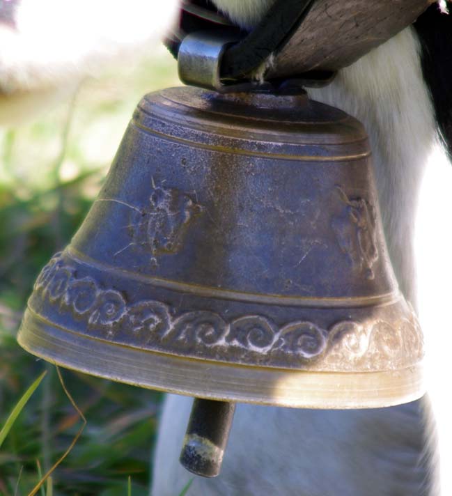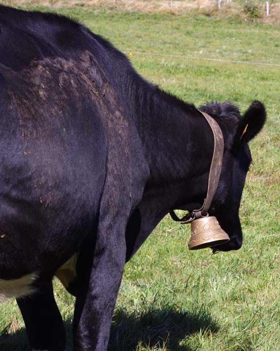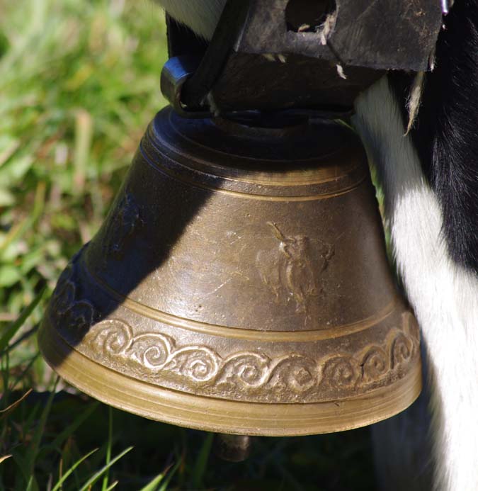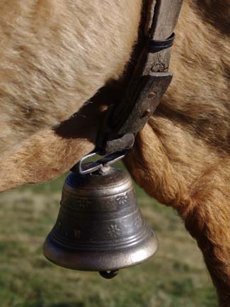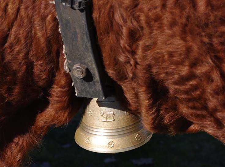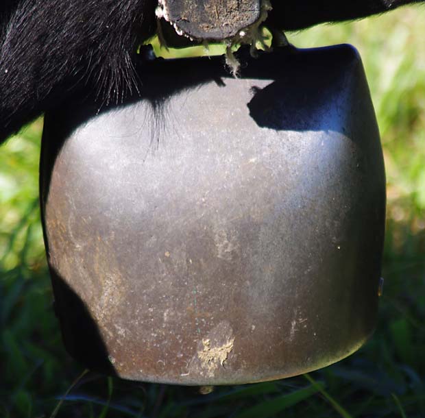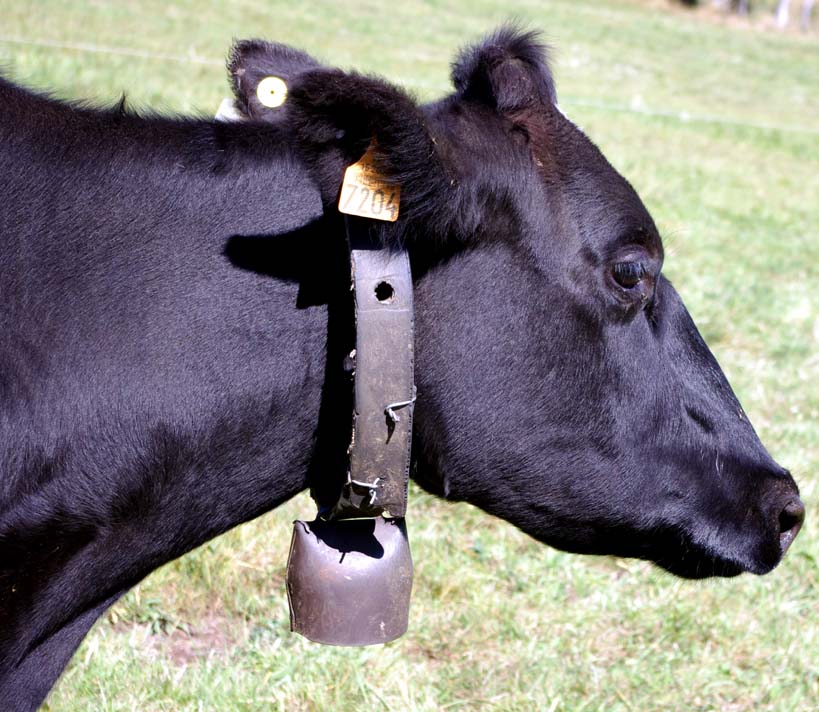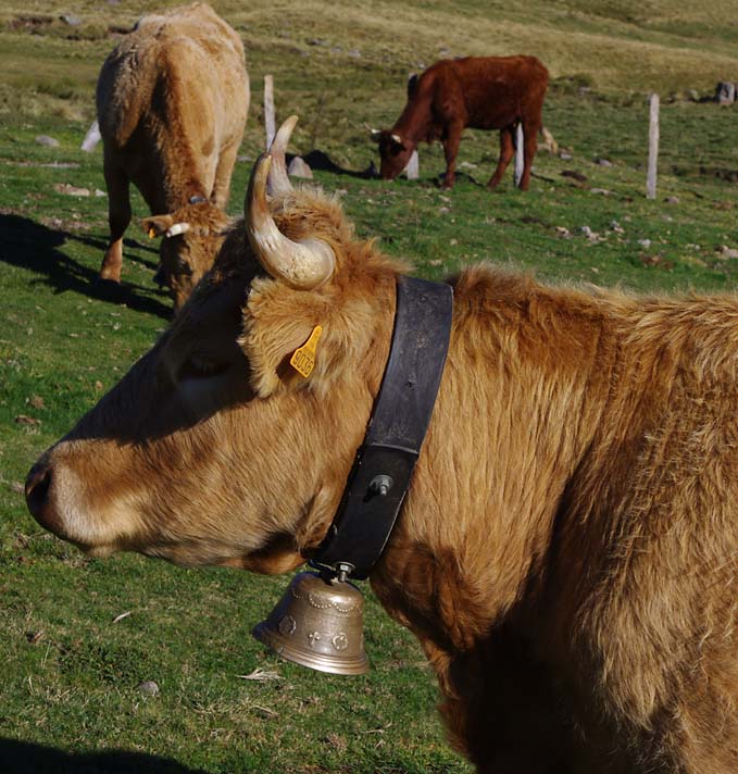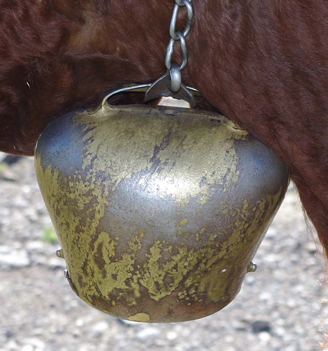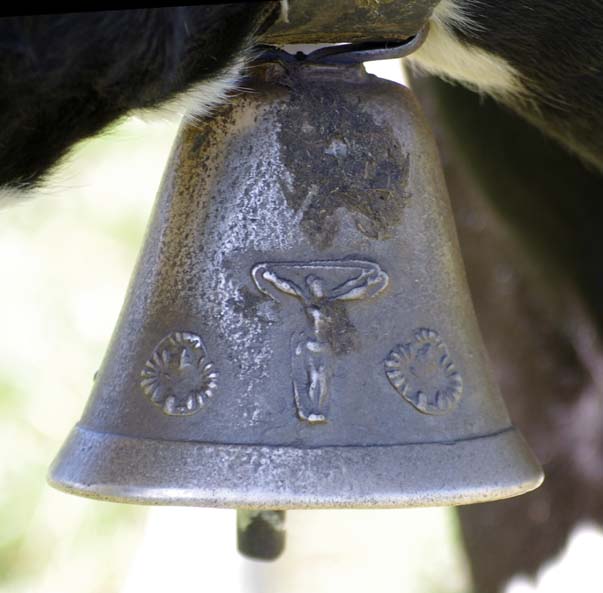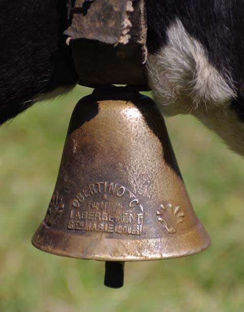Celles qui sont sur les vaches datent de mes parents. Nous on mettait des cloches, moi, j’ai toujours entendu dire ça, la tradition, c’est parce que dans les montagnes quand on les perdait dans le brouillard on entendait les cloches. Les veaux reconnaissent la cloche de leur mère. On ne change pas de cloche pour sevrer comme on fait avec les brebis, peut-être que c’est plus docile les brebis, nous avec la vache c’est pas toujours.